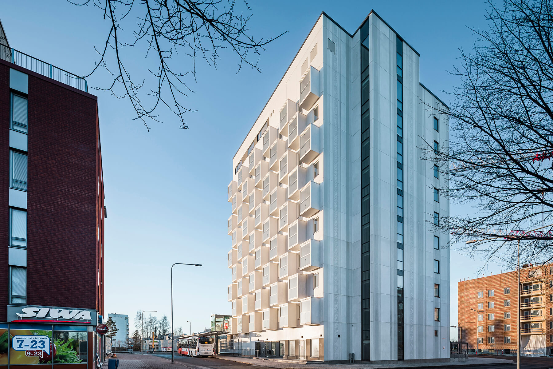 The jury describes the award-winning high-rise building as a prestige landmark of Vuosaari, one of the eastern neighbourhoods in Helsinki, Finland. By knowledgeable use of concrete and seamless co-operation between each of the organisations involved, the result is a structurally successful and expressive architectural concept.