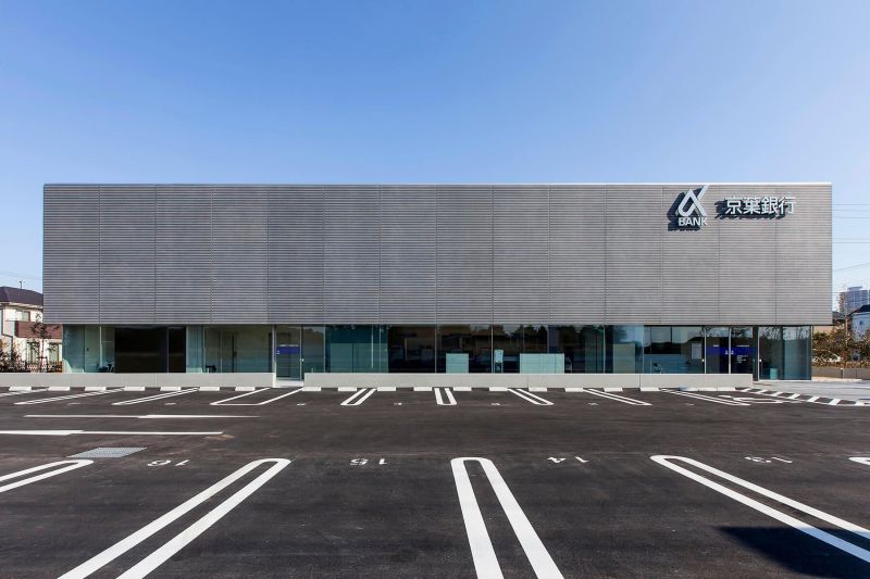 The repetitive, unique pattern in Graphic Concrete on the Keiyo Bank's facade is made of the bank's logo.