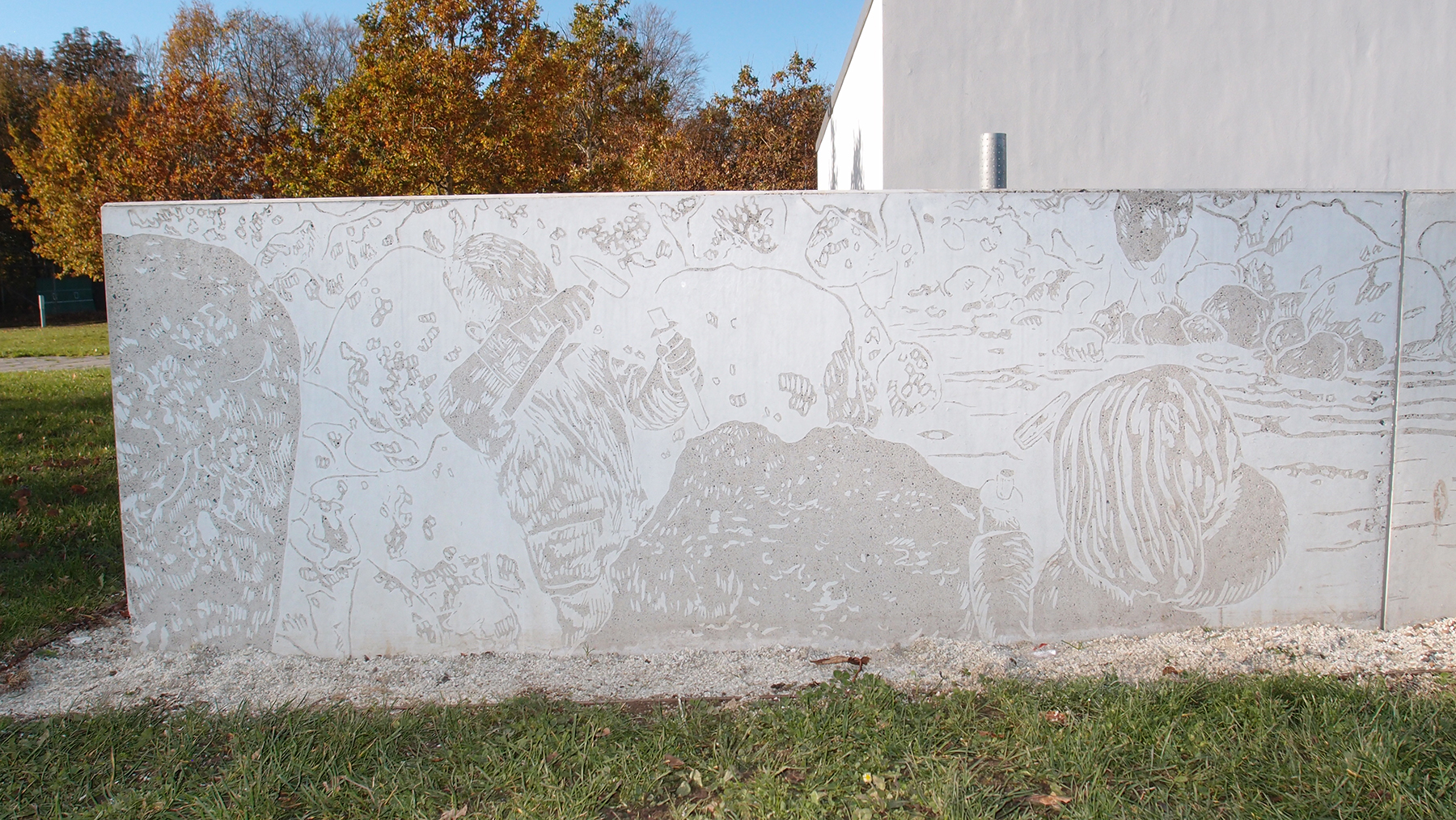 Etched into the surface of the concrete, the images are discreetly revealed, as they would appear in the quarry walls. While walking along the park's main path, visitors can follow the timeline, which covers a huge expanse of time. It starts with an asteroid hitting the earth approximately 65 million years ago, moves on to the fossils of the Danian Age and the Ice Age, and ends in the present day with children chiseling at fossils in the limestone quarry - a popular activity in the quarry today.