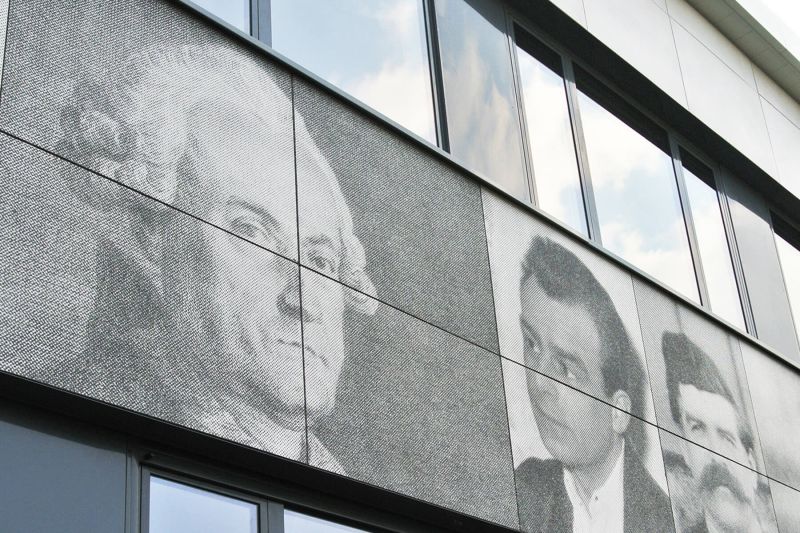 The facade of The Crevin Upper Secondary School depicts 28 iconic persons who have had their influence in the cultural development of Bretagne, including the author Colette, the artist Clotilde Vautier, the film director Charles Vanel and the poet Gilles Fournel.