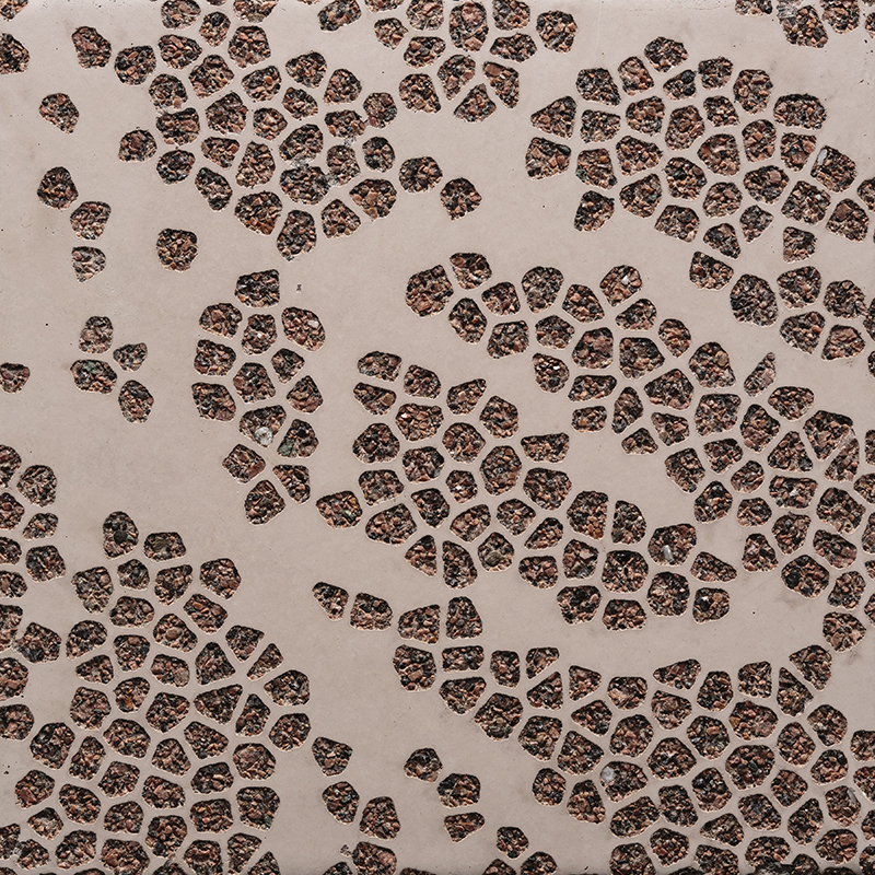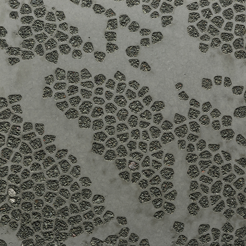 Der Kontrast zwischen freigelegten Zuschlagstoffen und glatten Oberflächen definiert das Graphic-Concrete-Muster. Der Kontrastgrad kann Ergebnisse von dramatisch und markant bis elegant und subtil erzeugen. Grauer Zement wird am häufigsten verwendet, jedoch können auf glatten Oberflächen leichte Farbabweichungen auftreten. Weißer Zement sorgt für eine gleichmäßigere Farbwirkung als grauer Zement.
