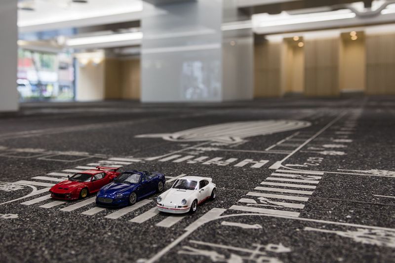 G735 Gallery is a multi-functional exhibition space for cars and artwork located in the heart of Ginza, Tokyo. A total of 1500 pieces of precast Graphic Concrete floor tiles illustrates the streets of the Ginza area. The black exposed aggregate -surface and the surface of the smooth white lines gives a maximum contrast, showing the map very precisely.
