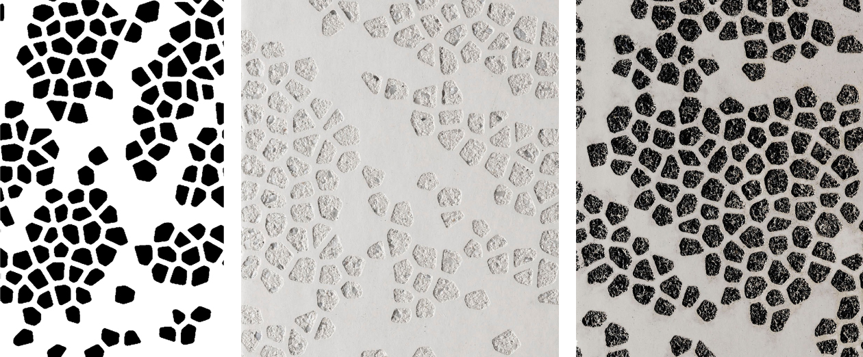 Muista, että graafisen betonin kuvio muodostuu kahden eri pinnan välisestä kontrastista - sileän sementtipinnan (l. puhdasvalupinta/muottipinta) ja hienopesupinnan (l. pinta, jossa betonin kiviaines on näkyvissä). Tämä tarkoittaa sitä, että graafisen betonin kuviossa voi olla vain kahta eri väriä: 100% mustia ja 100% valkoisia alueita.
