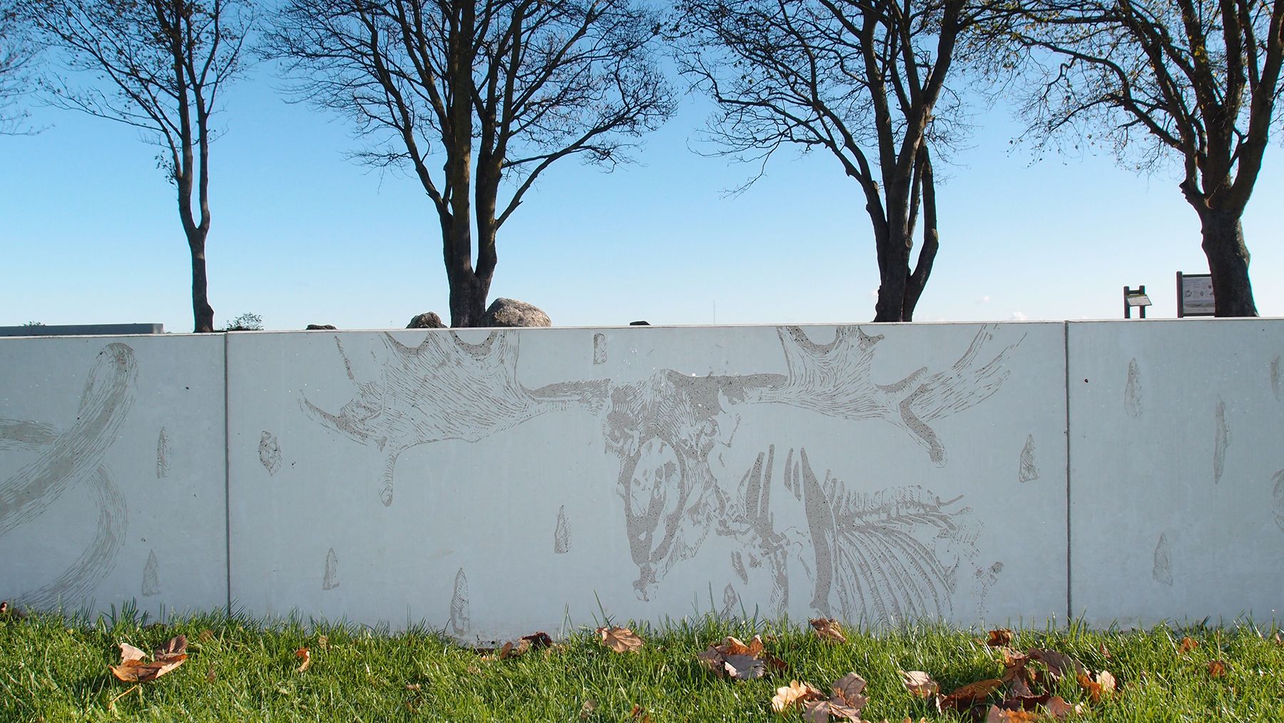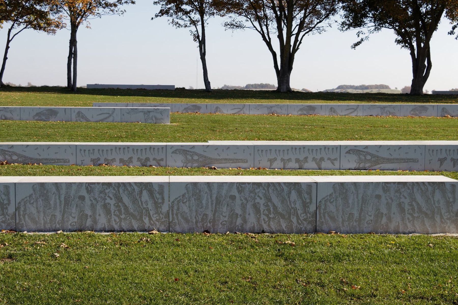 Etched into the surface of the concrete, the images are discreetly revealed, as they would appear in the quarry walls. While walking along the park's main path, visitors can follow the timeline, which covers a huge expanse of time. It starts with an asteroid hitting the earth approximately 65 million years ago, moves on to the fossils of the Danian Age and the Ice Age, and ends in the present day with children chiseling at fossils in the limestone quarry - a popular activity in the quarry today.