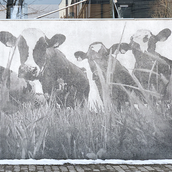 Inspiriert von einem Zeitungsbild mit Kühen, wollte der Architekt die Geschichte des Region in der Fassade dieses Wohngebäudes widerspiegeln. Nach 14 Jahren sind die Muster auf der Fassade immer noch deutlich sichtbar.