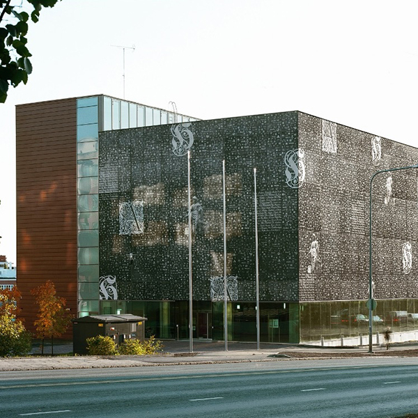 Als Gewinner des finnischen Betonbauwerks des Jahres 2009 beeindruckt diese schwarze Fassade mit Inschriften aus historischen Archiven – von bäuerlichen Lesezeichen über königliche Briefe bis hin zu modernen digitalen Symbolen.