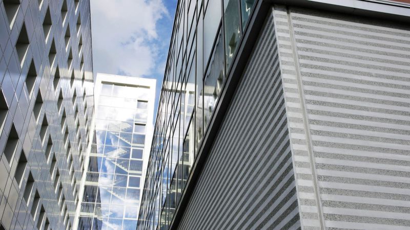 Espoo Hospital is a great example of how Graphic Concrete can be used on large concrete element surfaces. This is not the only cost-effective solution for the large surface, but also cherish the main concept of the building design on both a big and small scale. The pattern creates an interesting façade while concealing the vertical seams between the elements. When viewed up close the pattern reveals the point raster, but as you move away the vertical lines take precedence. When viewing the entire building, the horizontal appearance is emphasised by the horizontal seams that divide the pattern. Graphic Concrete patterns make it possible to either conceal or highlight the seams between the elements.